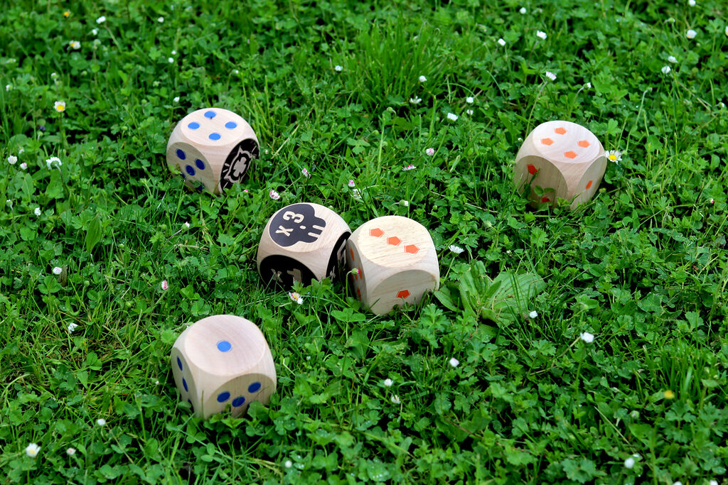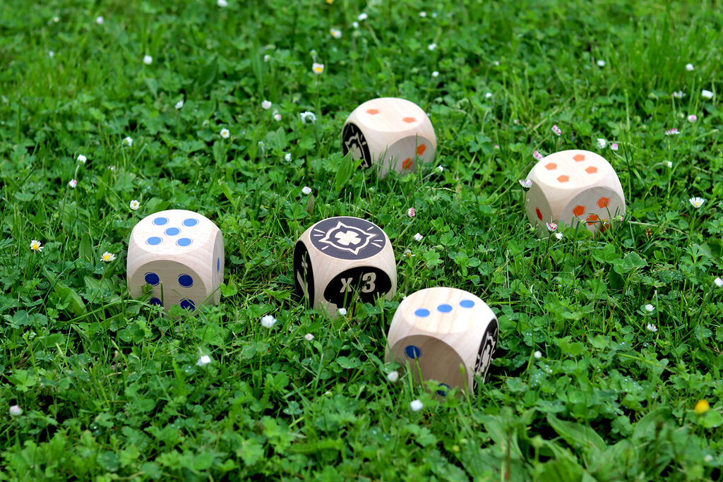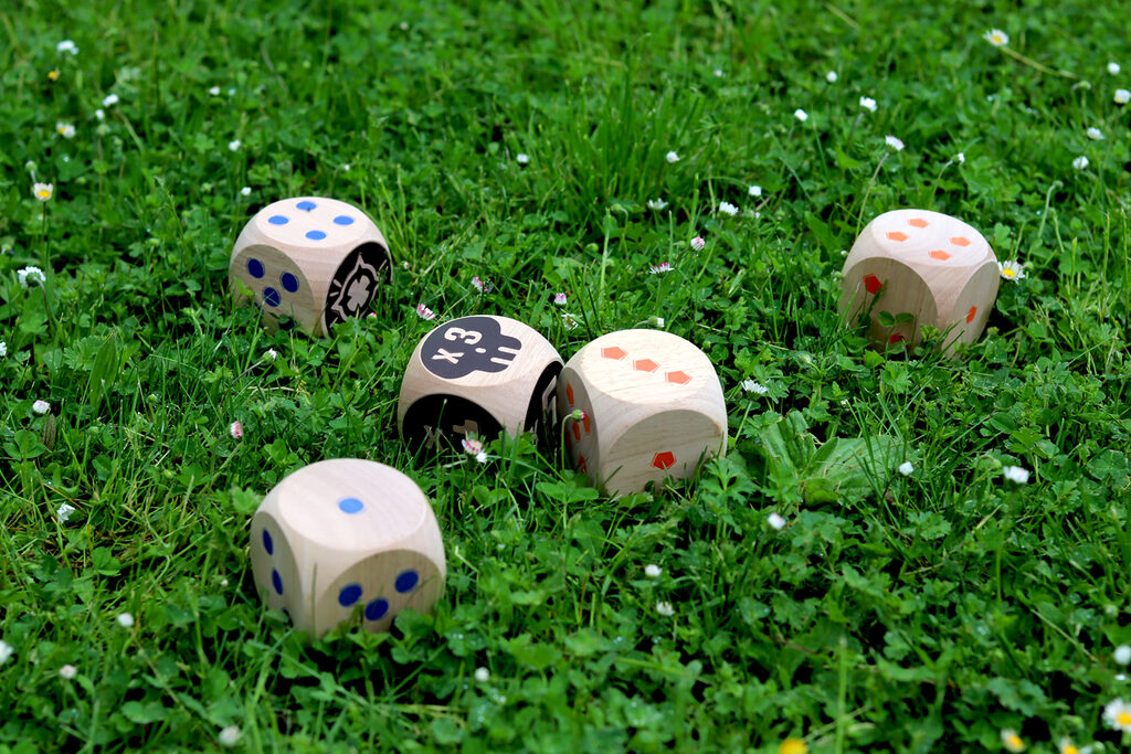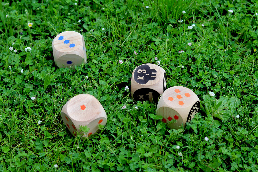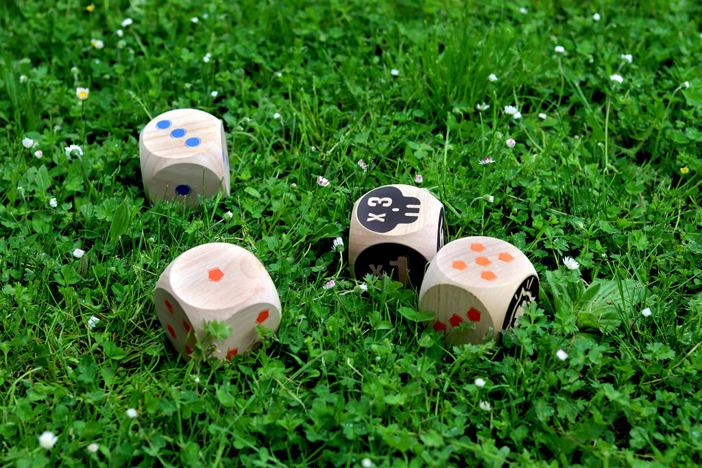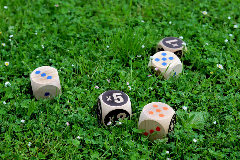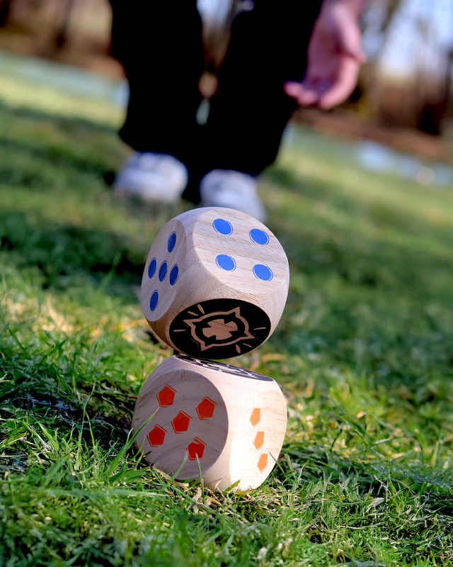 The blue team faces the orange team, first to 50 points wins! Throw the 2 Maros. You will then need to roll your dice as close to them as possible. Then, throw your dice in turn to try and score points. When there are no more dice, only the dice closest to the two Maros score points! Multiply the Maro face by the face up of your die.