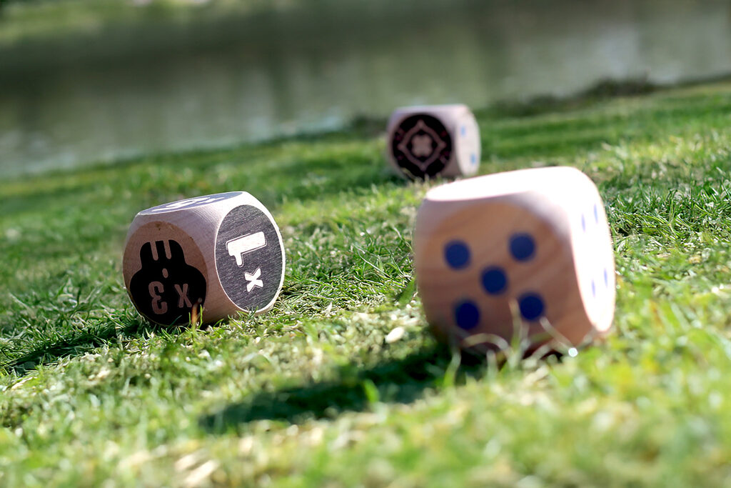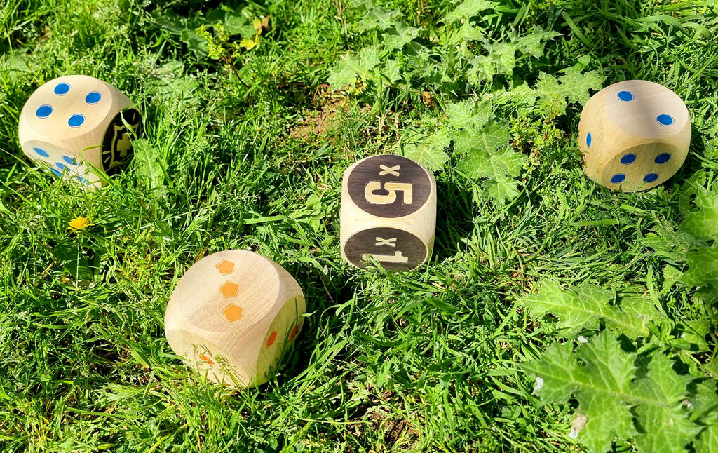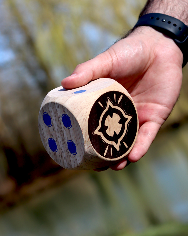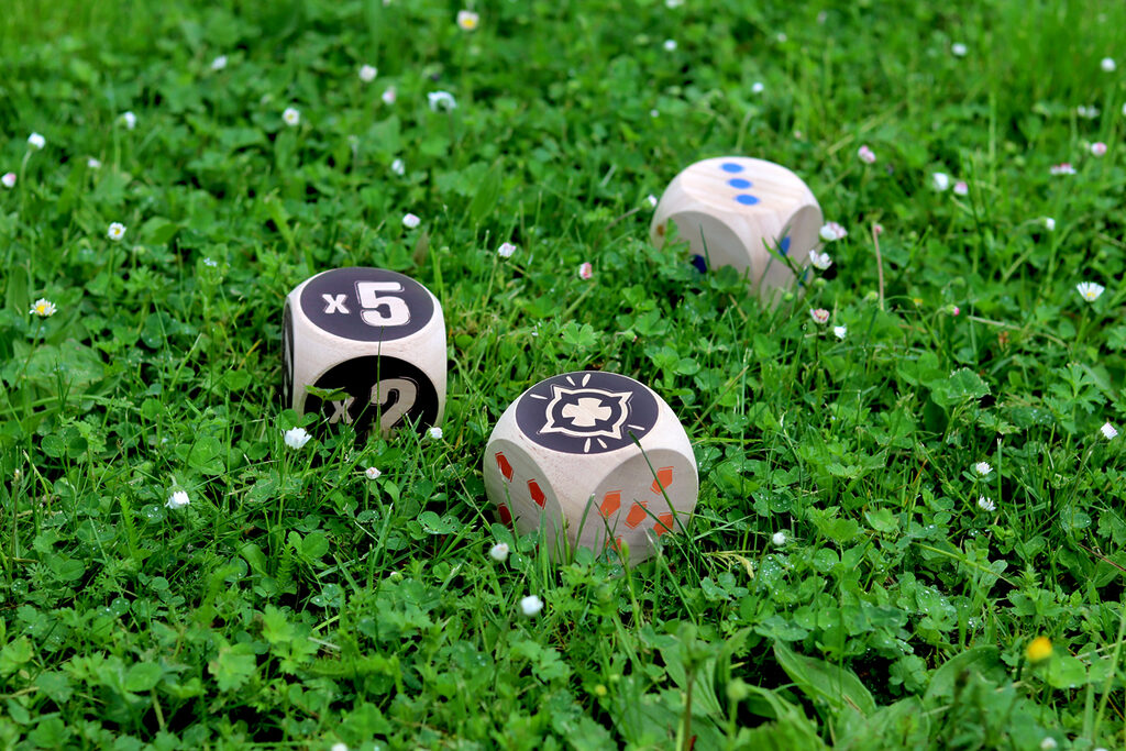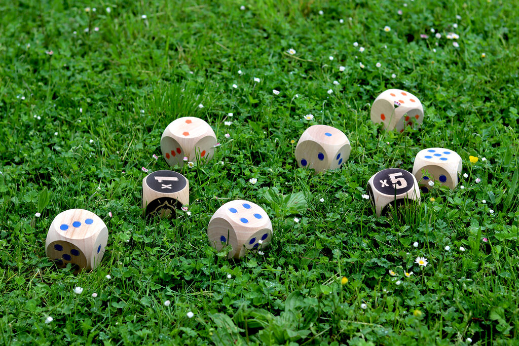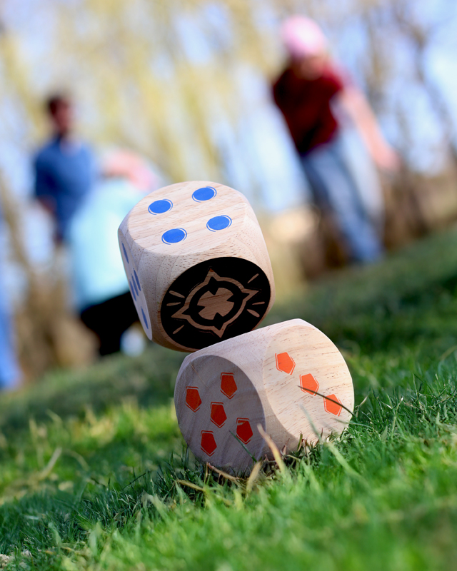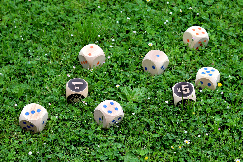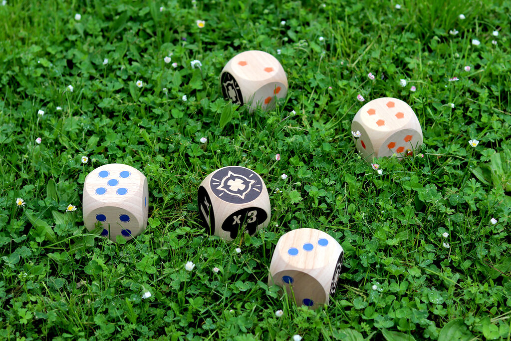 The blue team faces the orange team, first to 50 points wins! Throw the 2 Maros. You will then need to roll your dice as close to them as possible. Then, throw your dice in turn to try and score points. When there are no more dice, only the dice closest to the two Maros score points! Multiply the Maro face by the face up of your die.